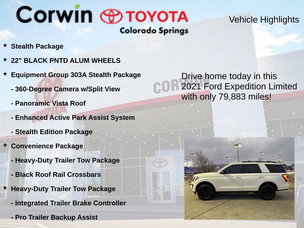 This Ford Expedition is well equipped and includes the following features and benefits, Stealth Package, 22" BLACK PNTD ALUM WHEELS, 360-Degree Camera w/Split View, Black Roof Rail Crossbars, Convenience Package, Enhanced Active Park Assist System, Equipment Group 303A Stealth Package, Heavy-Duty Trailer Tow Package, Navigation System, Panoramic Vista Roof, Stealth Edition Package.