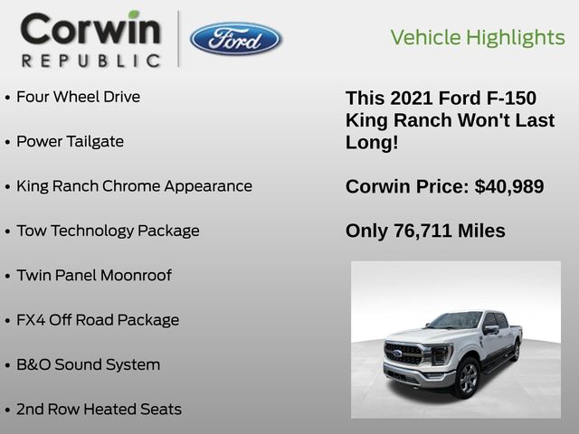 Whether you're hauling heavy loads, exploring off-road adventures, or simply seeking a premium driving experience, this 2021 Ford F-150 King Ranch is the perfect companion. Visit Corwin Ford of Republic today and discover why this exceptional truck should be your next automotive partner.
