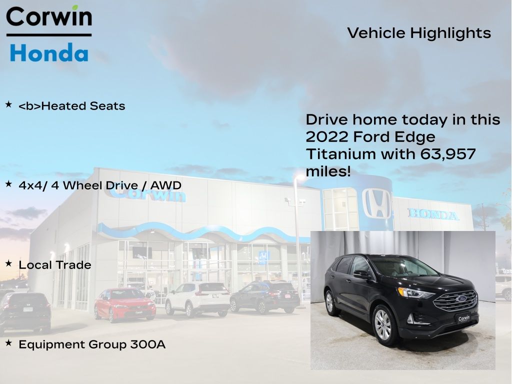 SAVE BIG IN 2026 WITH A GREAT DEAL ON ONE OF OVER 200 PRE-OWNED VEHICLE'S AT CORWIN HONDA. Recent Arrival! 2022 Agate Black Metallic Ford Edge Titanium AWD
