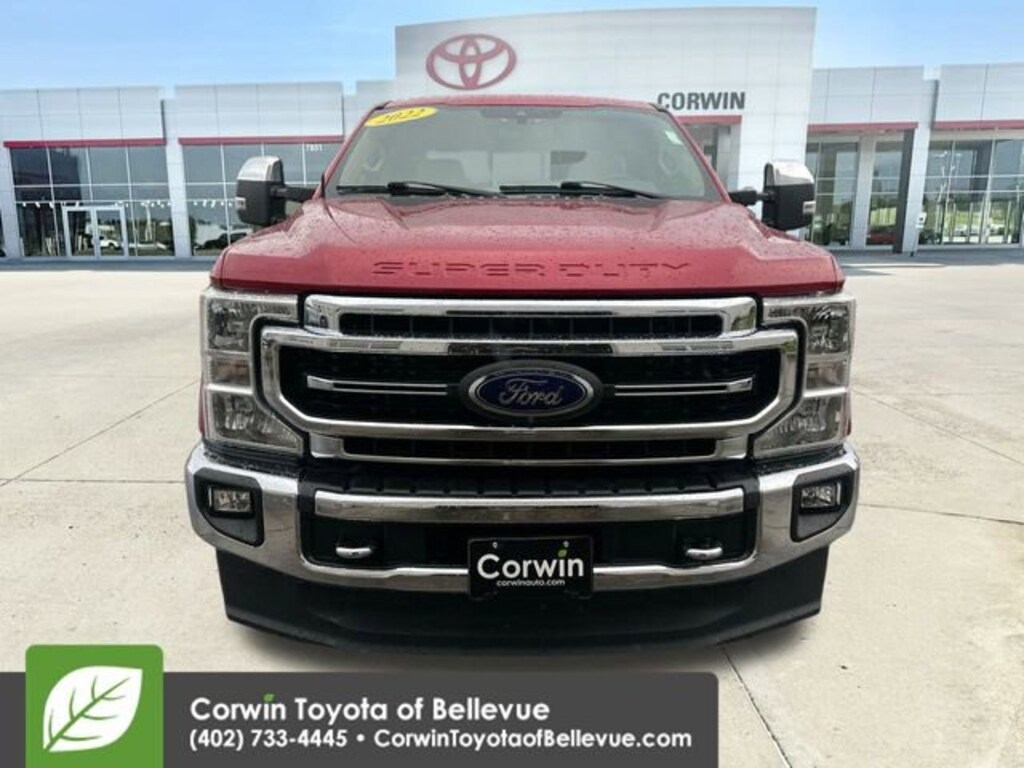 Our rugged, One Owner, Low Mileage 2022 Ford F-250 Super Duty Lariat Crew Cab 4X4 with the Ultimate Pack has refined features and remarkable strength in Rapid Red! Motivated by a 6.2 Liter V8 offering 385hp to a 6 Speed Automatic transmission for massive towing and hauling capability. This Four Wheel Drive truck also inspires you to take on your biggest jobs, and it catches your attention with classic SuperDuty good looks. A mighty chrome grille sets the tone to go with chromed-steel bumpers, fog lamps, bold alloy wheels, Ford's PowerScope trailer mirrors, and our package that adds LED box lighting and power-release tailgate with an access step. Step bars, a tow hitch receiver, a spray-on bedliner, and a tonneau cover have also been installed.