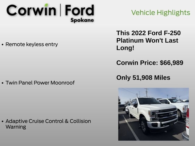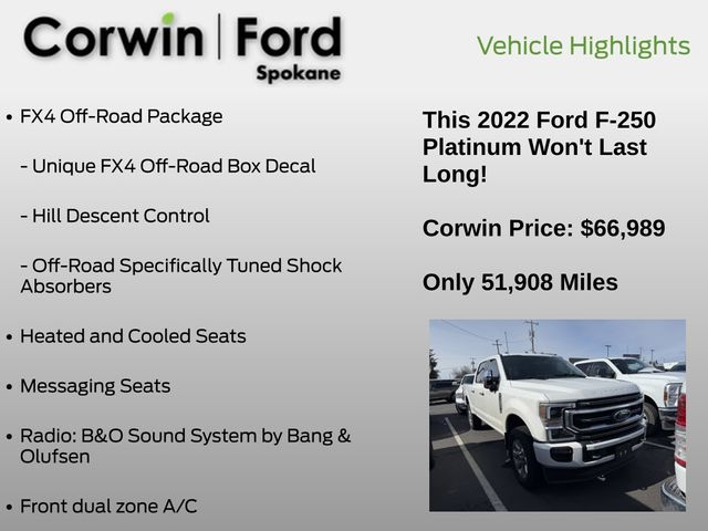 If you're in the market for a powerful, versatile, and well-equipped truck, this 2022 Ford F-250SD Platinum is an exceptional choice. Come in and experience it for yourself today â" we're confident that you'll be impressed by its capabilities and premium features.