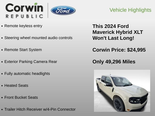 Discover the versatile and fuel-efficient 2024 Ford Maverick XLT, a compact pickup that's ready to elevate your driving experience. This well-equipped model boasts an impressive array of features designed to enhance your daily commute and weekend adventures.