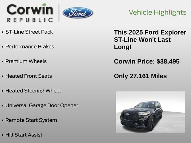 Under the hood, this Explorer ST-Line is powered by a potent 2.3L EcoBoost I-4 engine paired with a smooth-shifting 10-Speed Automatic transmission and intelligent 4WD system. With an impressive 20 city / 27 highway MPG, you'll enjoy the perfect balance of power and efficiency.