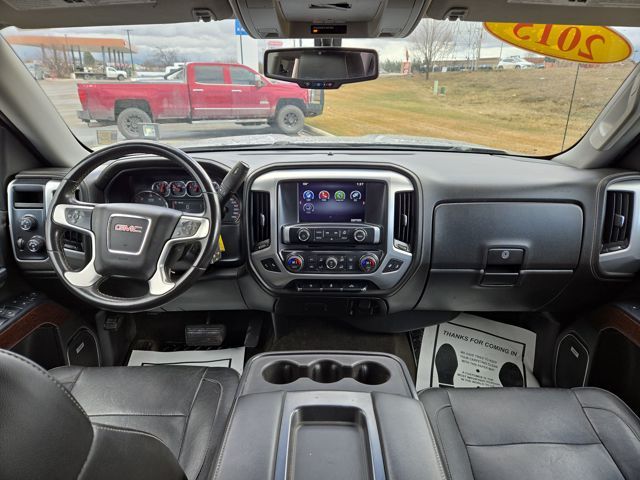 Style meets substance in our 2015 GMC Sierra 1500 SLT Crew Cab 4X4 presented in beautiful Onyx Black. Powered by a 5.3 Liter V8 that offers 355hp paired with a 6 Speed Automatic transmission with Tow/Haul mode to provide great hauling and towing capability. Paired with coil-over-shock front suspension, this Four Wheel Drive offers a controlled ride that is comfortable, plus scores nearly 22mpg on the highway. Our handsome truck has attractive chrome accents, halogen front fog lamps, drop-in bedliner, step bars, a tonneau cover, and an EZ Lift and Lower locking tailgate.