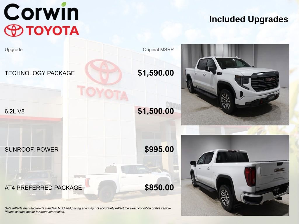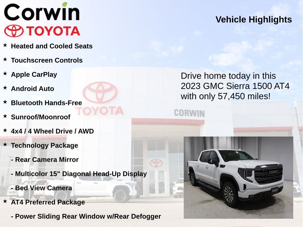 This GMC Sierra 1500 is well equipped and includes the following features and benefits, Heated and Cooled Seats, Touchscreen Controls, Apple CarPlay, Android Auto, Bluetooth Hands-Free, Sunroof/Moonroof, 4x4 / 4 Wheel Drive / AWD, EcoTec3 6.2L V8, Adaptive Cruise Control, AT4 Preferred Package, Bed View Camera, Multicolor 15" Diagonal Head-Up Display, Power Sliding Rear Window w/Rear Defogger, Rear Camera Mirror, Technology Package, Universal Home Remote.