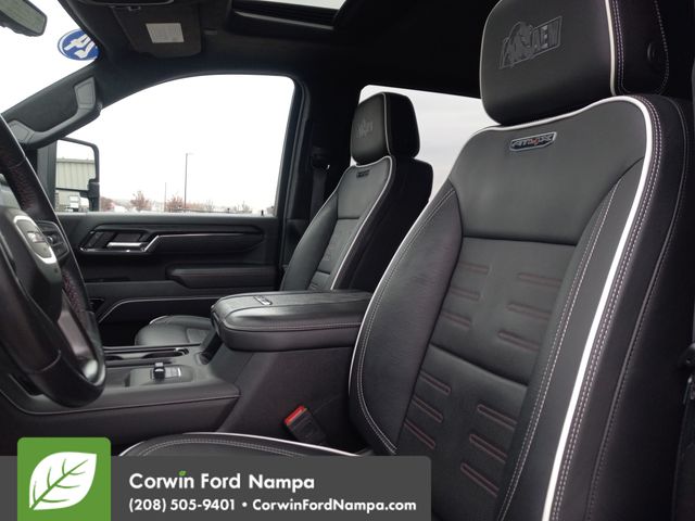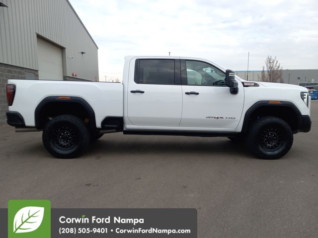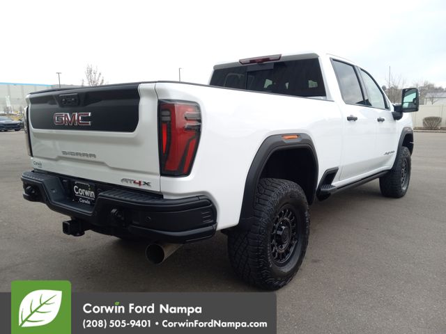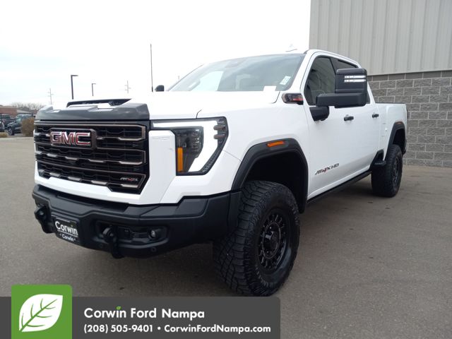 Refined and powerful, our Diesel powered 2024 GMC Sierra 2500HD AT4X Crew Cab 4X4 is a terrific trail machine made for hard work in Summit White! Motivated by a TurboCharged 6.6 Liter DuraMax Diesel V8 offering 470hp and 975lb-ft of torque to a 10 Speed Allison Automatic transmission. This Four Wheel Drive truck can also bring its bold capability off the beaten path with an off-road suspension, a 2-inch lift kit, a full-locking rear diff, and Multimatic DSSV dampers. Our Sierra turns heads with animated LED headlamps, power assist steps, a power sunroof, a spray-on bedliner, alloy wheels, and a MultiPro tailgate with a built-in sound system.