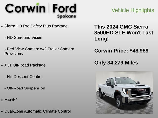 When the job calls for serious off-road capabilities, the Sierra 3500HD SLE delivers. The X31 Off-Road Package equips this truck with the tools you need to conquer challenging terrain, including an off-road suspension, traction control, and hill descent control. Whether you're hauling heavy loads or exploring the great outdoors, the Sierra 3500HD SLE is up for the task.