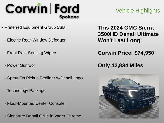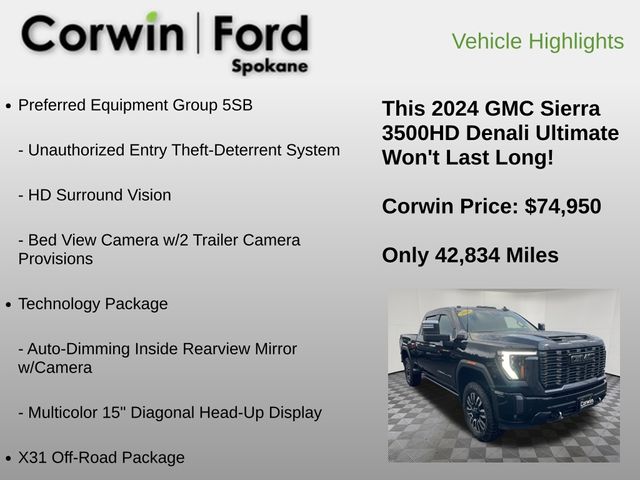 This GMC Sierra 3500HD is well equipped and includes these key features and benefits, Collision Warning System, 360 degree Camera, Adaptive Cruise Control, Heated and Cooled Seats, Blind-Spot Monitors, Touchscreen Controls, Heads-Up Display, Backup Camera, Keyless Access with Push Button Start, Apple CarPlay, Android Auto, Bluetooth Hands-Free, Moonroof, Sierra 3500HD Denali Ultimate, 4D Crew Cab, Duramax 6.6L V8 Turbodiesel, 10-Speed Automatic, 4WD, Onyx Black, Alpine Umber Leather, 12 Speakers, 120-Volt Bed Mounted Power Outlet, 120-Volt Instrument Panel Power Outlet, 2 Charge-Only Rear USB Ports, 2 Charge/Data USB Ports Inside Center Console, 2 USB Ports, 2-Speed Active Transfer Case, Automatic temperature control, Bed View Camera w/2 Trailer Camera Provisions, Bose Premium Series 12-Speaker System, Deep-Tinted Glass, Electric Rear-Window Defogger, Floor-Mounted Center Console, Front Rain-Sensing Wipers, Gooseneck/5th Wheel Prep Package, HD Surround Vision, Heated 2nd Row Outboard Seats, Heated Driver & Front Outboard Passenger Seats, Integrated Trailer Brake Controller, Keyless Open & Start, LED Cargo Area Lighting, LED Smoked Amber Roof Marker Lamps, Manual Tilt-Wheel/Telescoping Steering Column, Power Front Windows w/Passenger Express Up/Down, Power Sliding Rear Window w/Defogger, Power Sunroof, Preferred Equipment Group 5SB, ProGrade Trailering System, Push Button Start, Rear Cross Traffic Alert, Rear Wheelhouse Liners, Remote Vehicle Starter System, Safety Alert Seat, Signature Denali Grille in Vader Chrome, SiriusXM w/360L, Spray-On Pickup Bedliner w/Denali Logo, Steering Wheel Audio Controls, Technology Package, Trailer Camera Provisions, Trailer Side Blind Zone Alert, Trailer Tire Pressure Monitor Sensors, Ultrasonic Front & Rear Park Assist, Unauthorized Entry Theft-Deterrent System, Universal Home Remote, Ventilated Driver & Front Passenger Seats, Wireless Charging, Wireless Phone Projection, X31 Off-Road Package. Priced below KBB Fair Purchase Price!