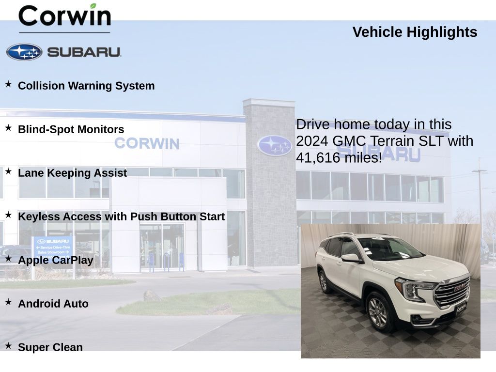 Highlighted by a robust 1.5L DOHC engine paired with a 9-speed automatic transmission and all-wheel drive, the 2024 Terrain SLT delivers a smooth and confident performance, offering an impressive balance of power and efficiency with 23 city and 28 highway MPG.