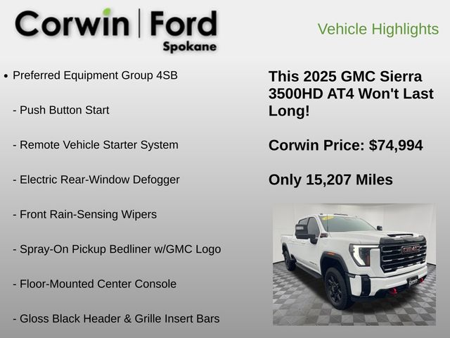Staying safe is mandatory, so GMC welcomes our Premium Plus Pack to add a head-up display and digital rearview mirror to HD surround vision, automatic braking, trailer-capable blind-spot monitoring, lane-departure warning, hitch view/guidance, trailer sway control, and more. A mighty workhorse, our Sierra 3500 AT4 is made to do better! Save this Page and Call for Availability. We Know You Will Enjoy Your Corwin Ford Spokane Test Drive Towards Ownership! See us today at Corwin Ford Spokane. Family owned for over 100 years! Excellent selection of New and Used vehicles, Financing options. Serving Spokane, Pasco, Kennewick, Richland, Walla Walla, Hermiston, Umatilla, Yakima, Sunnyside, Grandview, Dayton, Prescott, Denton County, Franklin County, Yakima County, Spokane County, Adams County, Grant County, and the Greater Columbia Basin. *All Prices plus applicable sales tax, license, and a negotiable documentary service fee up to $200 may be added to sales price or capitalized cost of the vehicle. One vehicle unless otherwise noted and subject to prior sale without notice. While supplies last. EPA mileage estimates are for newly manufactured vehicles only. Your actual mileage will vary depending on how you drive and maintain your vehicle.