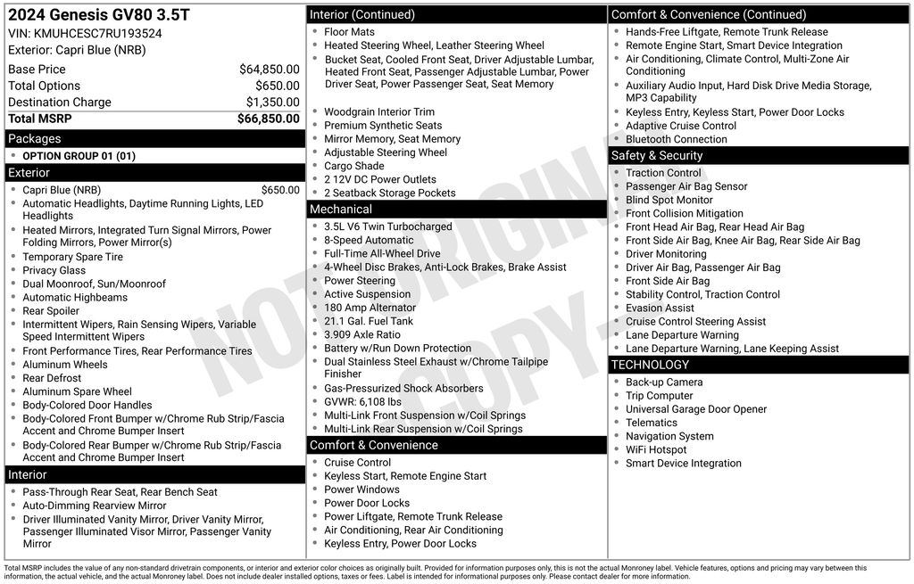 This 2024 Genesis GV80 3.5T is a true testament to the brand's commitment to excellence. With its stunning design, premium features, and exceptional performance, it's the perfect choice for those seeking a luxurious and capable SUV. Visit our showroom today to experience the GV80 for yourself and discover why it's the perfect addition to your lifestyle.
