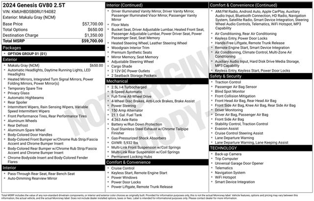 2024 Genesis GV80 2.5T AWD 8-Speed Automatic 2.5L DOHC Makalu Gray