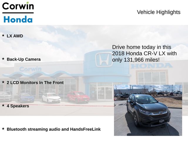 This 2018 Honda CR-V LX is a versatile and well-equipped SUV that's ready to take on your daily adventures. With its impressive fuel efficiency, all-wheel-drive capability, and a host of convenient features, this CR-V is the perfect blend of practicality and style.