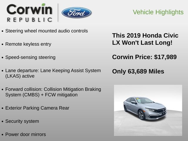 2019 Honda Civic LX FWD CVT 2.0L I4 DOHC 16V i-VTEC Lunar Silver Metallic 30/38 City/Highway MPG