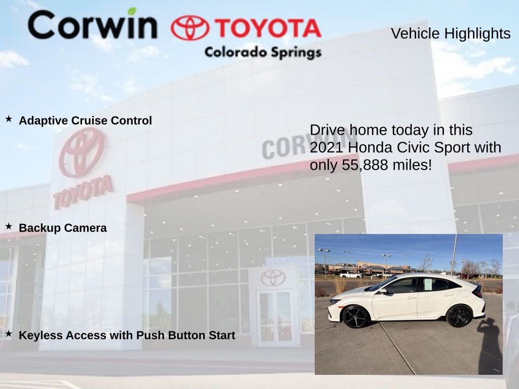This Honda Civic is well equipped and includes the following features and benefits, Adaptive Cruise Control, Backup Camera, Keyless Access with Push Button Start. Odometer is 5944 miles below market average! 29/35 City/Highway MPG