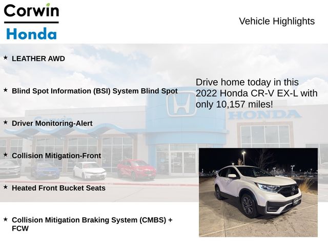 This 2022 Honda CR-V EX-L is a true standout in the crowded SUV market, offering a winning combination of style, performance, and premium features. With its impressive fuel efficiency, advanced safety systems, and luxurious interior, it's the perfect companion for your active lifestyle. Visit our showroom today and experience the exceptional value and quality of this remarkable vehicle.