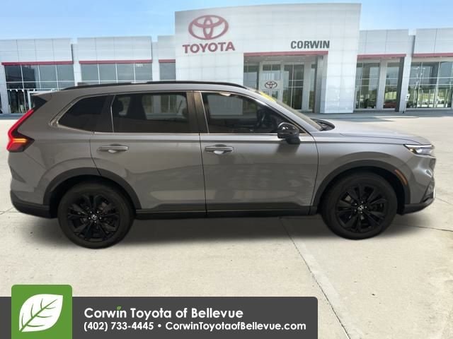 Drive our Accident Free, One Owner 2023 Honda CR-V Hybrid Sport Touring AWD to enjoy dynamic adventures and a distinctive Urban Gray Pearl design! Powered by a 2.0 Liter 4 Cylinder and 2 Electric Motors providing a combined 204hp tethered to an eCVT for energetic efficiency. This All Wheel Drive SUV proves the point by seeing nearly 40mpg in the city, and it has Snow and Sport modes for added capability. Bold and stylish, our CR-V Hybrid is ready to start exploring your world with LED lighting, a power sunroof, a hands-free liftgate, 19-inch black alloy wheels, black roof rails, and dual chrome exhaust outlets.