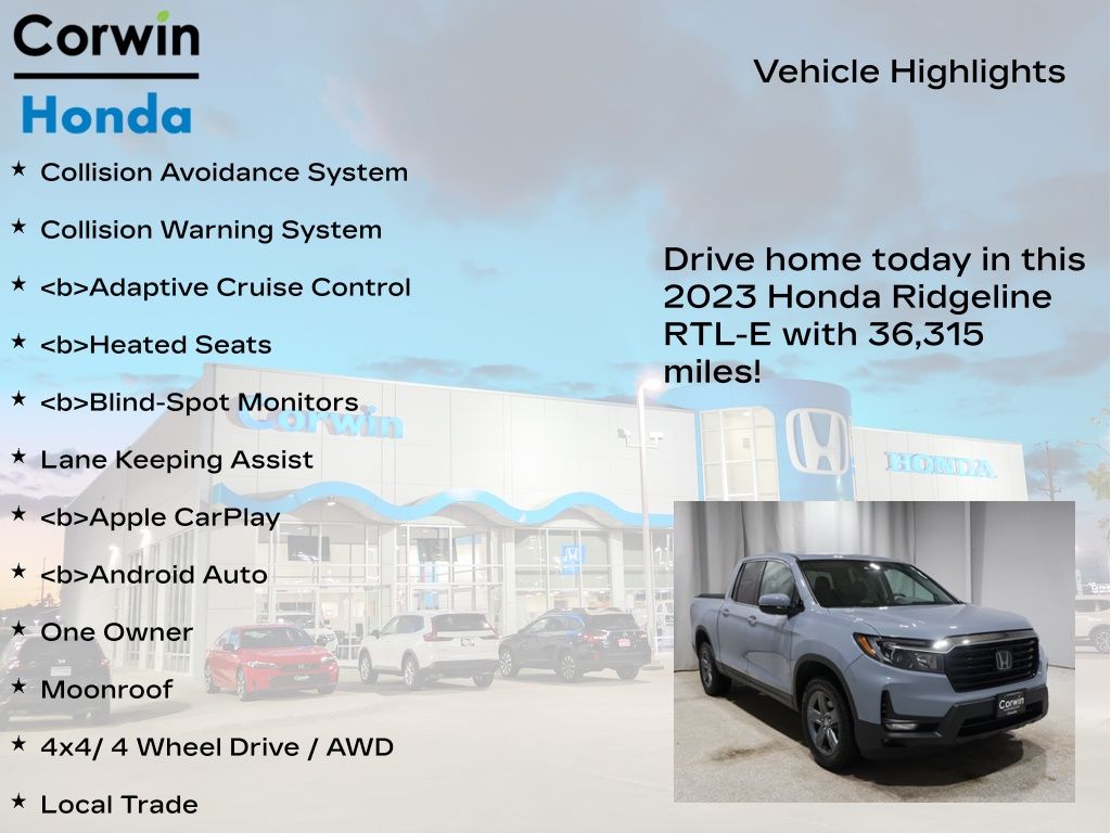 SAVE BIG IN 2026 WITH A GREAT DEAL ON ONE OF OVER 200 PRE-OWNED VEHICLE'S AT CORWIN HONDA. Recent Arrival! Priced below KBB Fair Purchase Price! 2023 Sonic Gray Pearl Honda Ridgeline RTL-E AWD CARFAX One-Owner. Clean CARFAX.