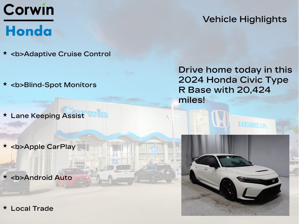 COME ON IN TO CORWIN Honda FOR YEAR END PRICING ON OVER 200 PRE-OWNED VEHICLES!! Priced below KBB Fair Purchase Price! 2024 Championship White Honda Civic Type R FWD CARFAX One-Owner. Clean CARFAX.