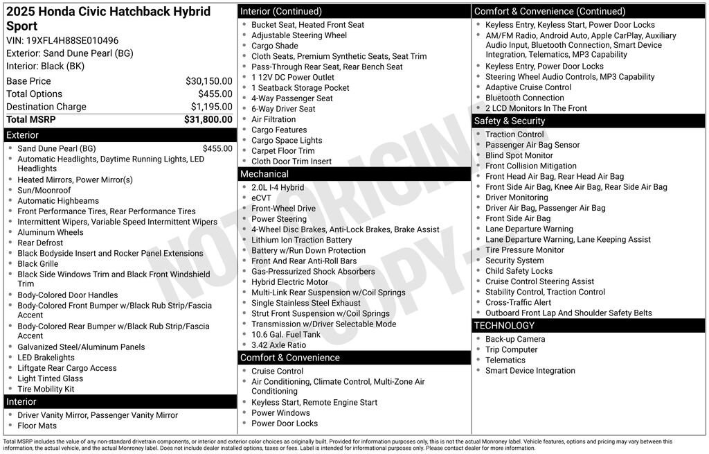 Priced below KBB Fair Purchase Price! 2025 Sand Dune Pearl Honda Civic Hybrid Sport CARFAX One-Owner. Clean CARFAX.