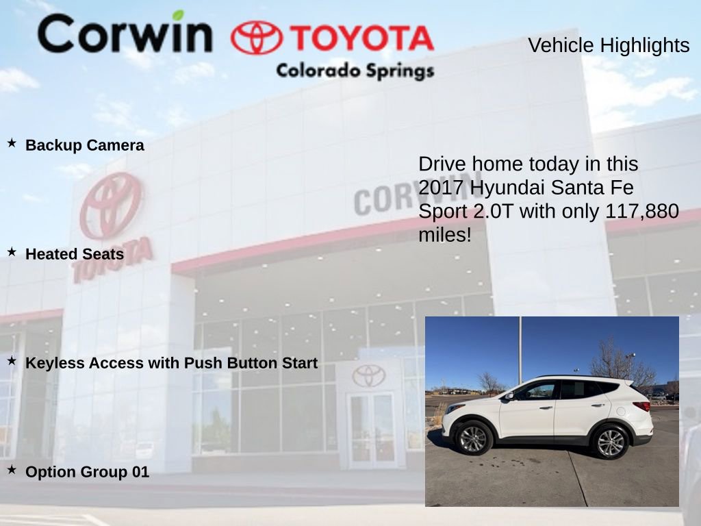 This Hyundai Santa Fe Sport is well equipped and includes the following features and benefits, Backup Camera, Heated Seats, Keyless Access with Push Button Start, Option Group 01. 20/28 City/Highway MPG