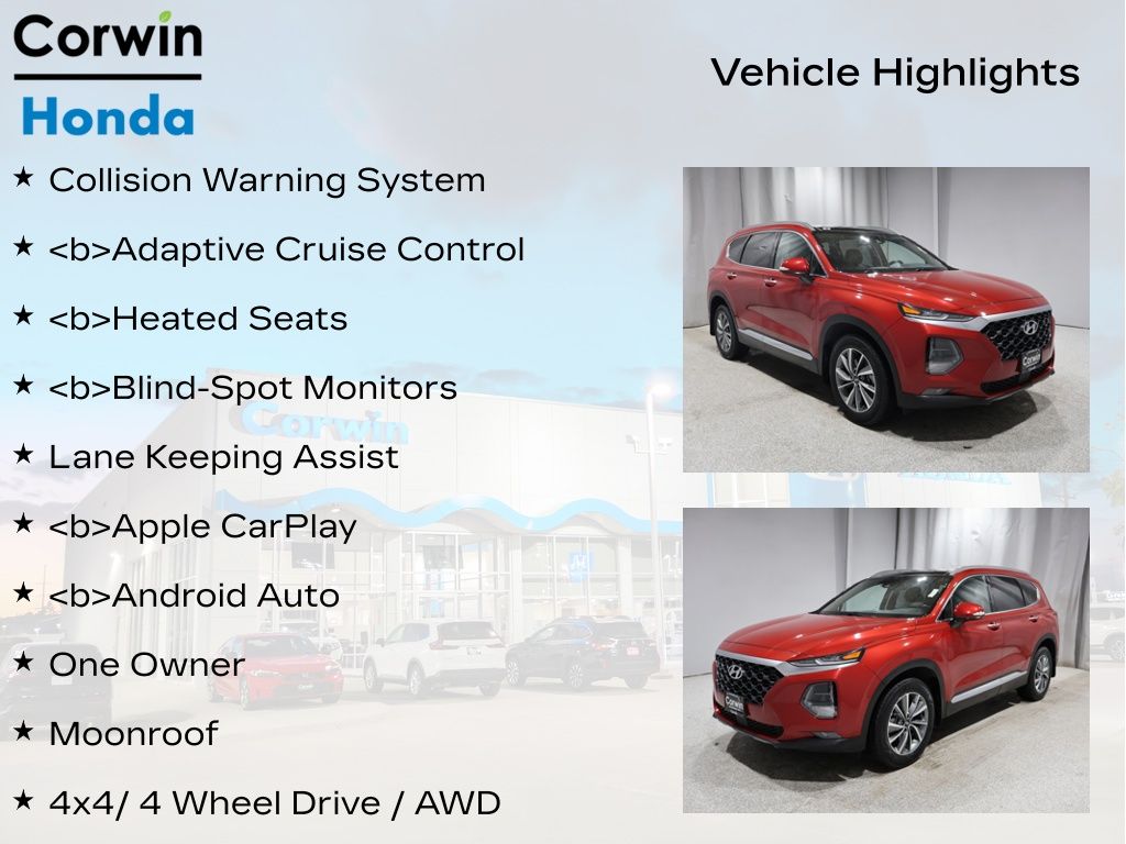 COME ON IN TO CORWIN Honda FOR YEAR END PRICING ON OVER 200 PRE-OWNED VEHICLES!! Priced below KBB Fair Purchase Price! 2019 Scarlet Red Hyundai Santa Fe Limited AWD CARFAX One-Owner. Clean CARFAX.