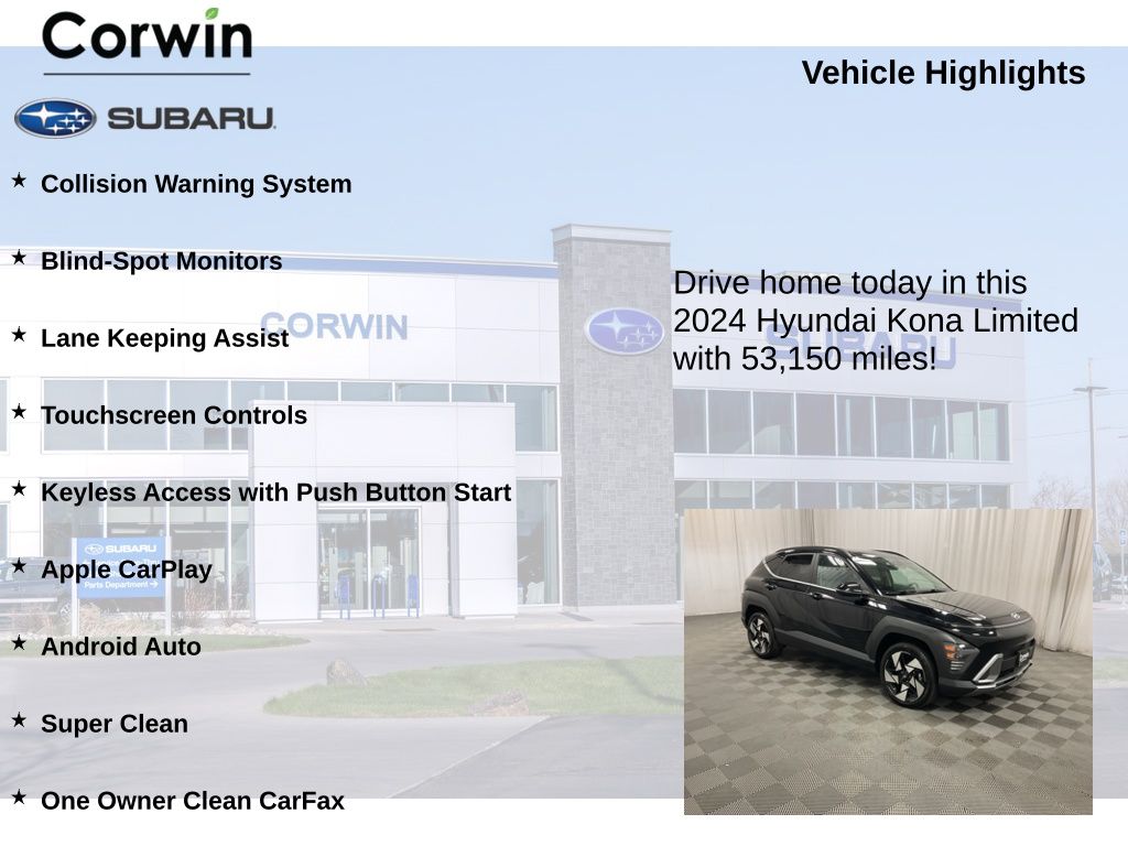 Whether you're commuting to work, running errands around town, or embarking on a weekend adventure, the 2024 Hyundai Kona Limited is the perfect companion. With its sleek styling, impressive performance, and comprehensive list of features, this Kona is sure to exceed your expectations and leave you eager to get behind the wheel.