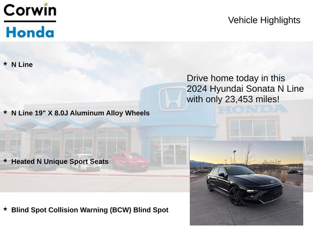 This Hyundai Sonata is well equipped and includes the following features and benefits, N Line, N Line 19" X 8.0J Aluminum Alloy Wheels, Heated N Unique Sport Seats, Blind Spot Collision Warning (BCW) Blind Spot. Odometer is 6381 miles below market average! 23/32 City/Highway MPG