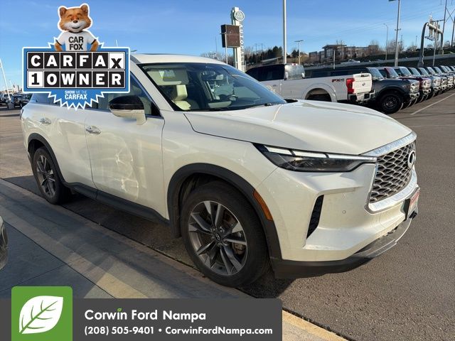 Confident and commanding, our Accident Free, One Owner 2023 INFINITI QX60 LUXE AWD in Majestic White is for drivers who live by their own rules! Motivated by a 3.5 Liter V6 that provides 295hp tethered to a paddle-shifted CVT for a terrific driving experience. Sport and Snow modes unlock upgraded capability, and this All Wheel Drive SUV sees nearly 25mpg on the highway. Our QX60 attracts attention as it goes by with strong lines, a panoramic sunroof, LED lighting, silver roof rails, gloss-black undercovers, a power liftgate, and 20-inch alloy wheels.