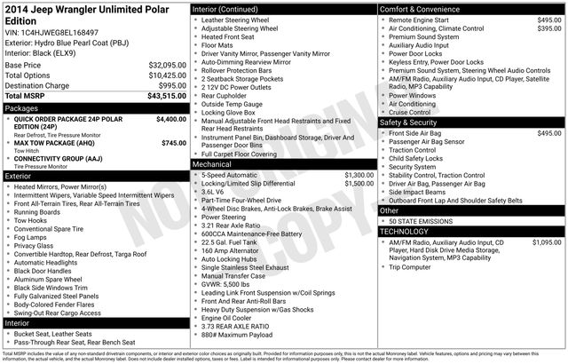 POLAR EDITION, REMOTE START SYSTEM, BODY COLOR 3-PIECE HARD TOP, BLACK, POLAR LEATHER SEATS W/PEARL ACCENT, Premium Amplifier, 2 12V DC Power Outlets and 1 Interior 120V AC Power Outlet, ABS brakes, Alloy wheels, Compass, Electronic Stability Control, Heated door mirrors, Illuminated entry, Low tire pressure warning, Remote keyless entry, Traction control. Odometer is 983 miles below market average!