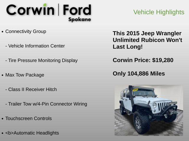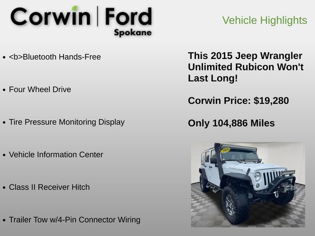 Recent Arrival! With the legendary terrain-tackling performance, our 2015 Jeep Wrangler Rubicon 4X4 shines bright in Bright White Clearcoat. Motivated by a 3.6 Liter V6 that offers 285hp combined with Dana axles and a 5 Speed Automatic transmission, helping you carve your path wherever you see fit. This Four Wheel Drive SUV offers nearly 20mpg on the highway and looks great with its snorkle, winch, LED lighting, aggressive stance and upgraded Rubicon wheels.