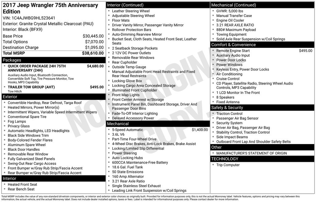 As a 75th Anniversary model, this Wrangler is a true collector's item, blending Jeep's legendary heritage with modern refinements. Whether you're an avid off-roader or simply seeking a versatile and stylish SUV, this 2017 Jeep Wrangler 75th Anniversary Edition is an exceptional choice that will elevate your driving experience.