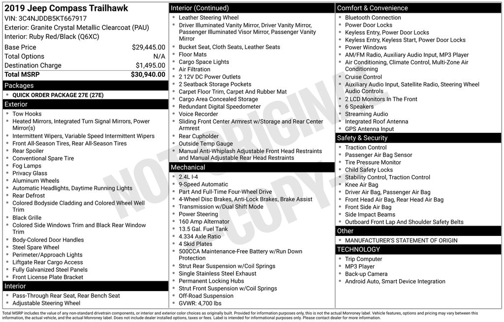 Experience the perfect balance of capability, comfort, and style with the 2019 Jeep Compass Trailhawk. Visit our showroom today and let us demonstrate how this exceptional SUV can elevate your driving experience.