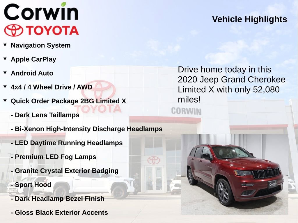 This Jeep Grand Cherokee is well equipped and includes the following features and benefits, Navigation System, Apple CarPlay, Android Auto, 4x4 / 4 Wheel Drive / AWD, 7 & 4 Pin Wiring Harness, Bi-Xenon High-Intensity Discharge Headlamps, Body Color Door Handles, Body Color Fascias w/Granite Accents, Body Color Sill Extension, Class IV Receiver Hitch, Dark Day Light Opening Moldings, Dark Headlamp Bezel Finish, Dark Lens Taillamps, Dual Dark Chrome Exhaust Tip, Gloss Black Exterior Accents, Gloss Black Roof Rails, Granite Crystal Exterior Accents, Granite Crystal Exterior Badging, Granite Crystal/Black Grille, Heavy-Duty Engine Cooling, Leather Trimmed Seats, LED Daytime Running Headlamps, Limited X Badge, Liquid Titanium Accents, Premium Accent Claddings, Premium LED Fog Lamps, Quick Order Package 2BG Limited X, Rear Load Leveling Suspension, Sport Hood, Steering Wheel Mounted Shift Control, Trailer Tow Group IV, Wheels: 20" x 8.0" Granite Crystal Aluminum. Odometer is 22704 miles below market average!