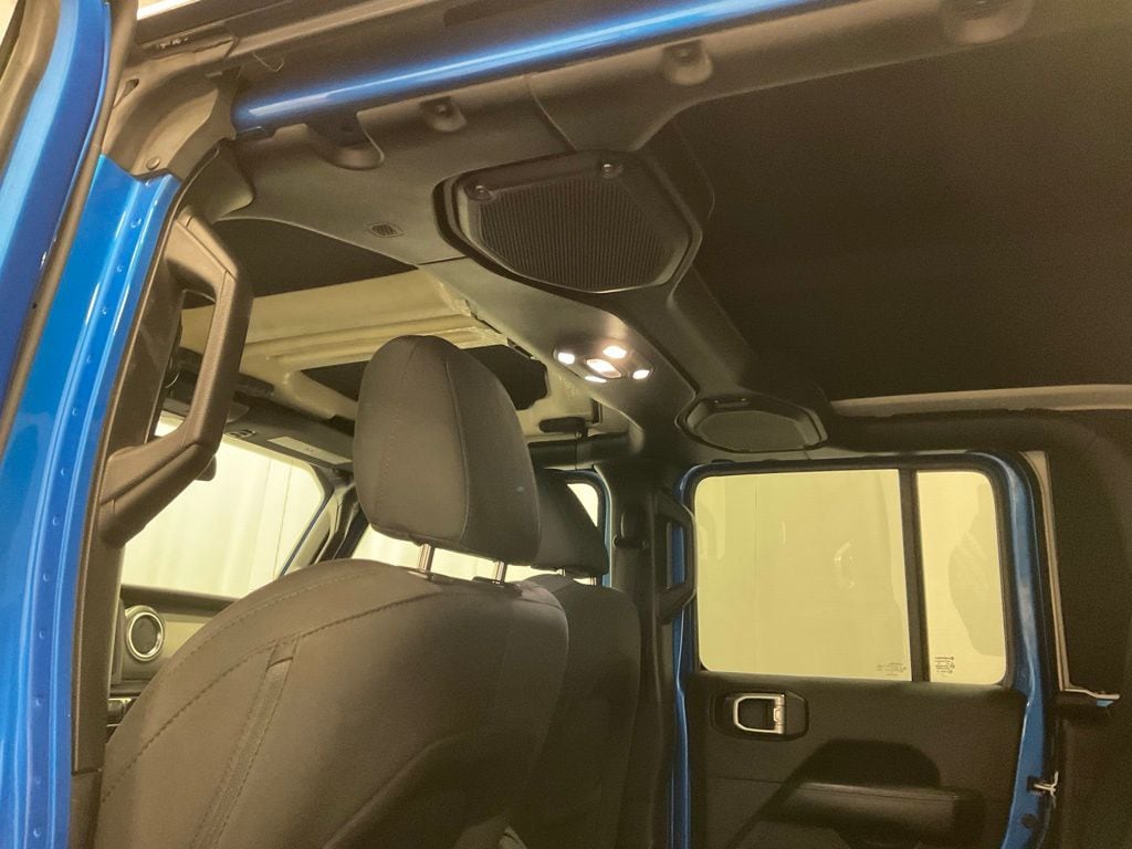 The exterior of this Jeep Gladiator Overland is a stunning Blue, complemented by the MOPAR Grab Handle Kit and 18-inch Granite Crystal Aluminum wheels. The Black 3-Piece Hard Top, Freedom Panel Storage Bag, and Rear Sliding Window provide versatility and convenience, while the MOPAR Hardtop Headliner adds a touch of refinement.