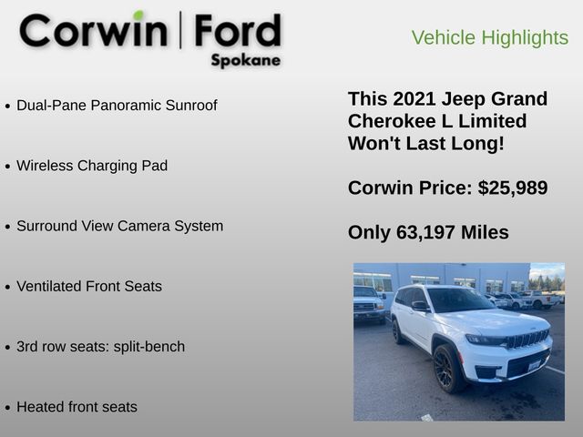 Whether you're embarking on a family adventure or seeking a luxurious daily driver, this 2021 Jeep Grand Cherokee L Limited is the perfect choice. Experience the pinnacle of Jeep capability and refinement. Visit our showroom today to take this exceptional SUV for a test drive and discover why it's the ideal vehicle for your lifestyle.