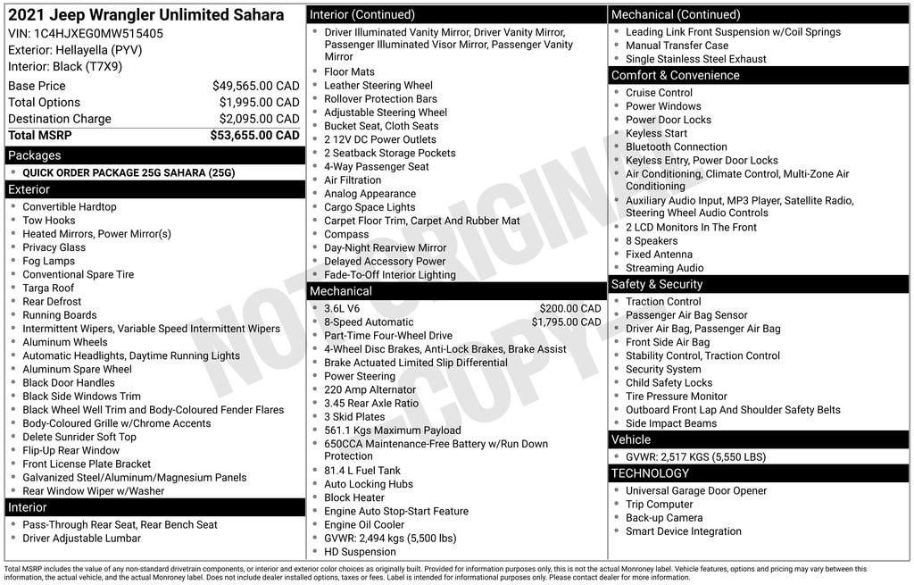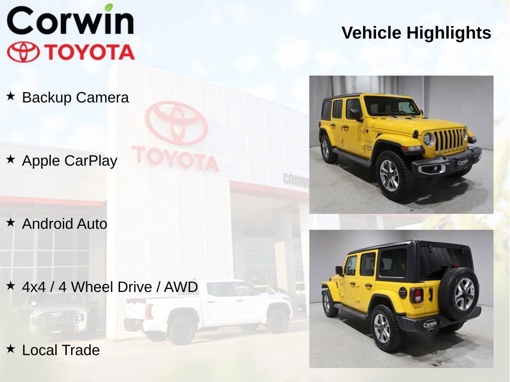 This Jeep Wrangler is well equipped and includes the following features and benefits, Backup Camera, Apple CarPlay, Android Auto, 4x4 / 4 Wheel Drive / AWD, Local Trade, 8-Speed Automatic.