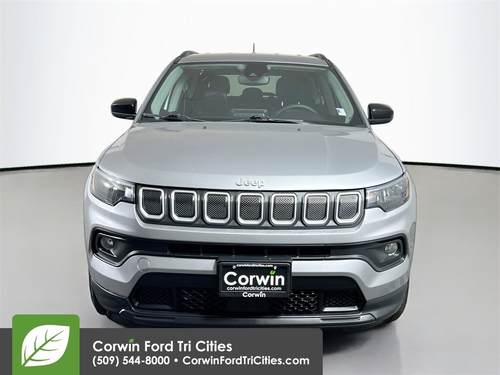 Our Accident Free 2022 Jeep Compass Latitude 4X4 in Billet Silver Metallic encourages you to forget about the map and follow your spirit! Motivated by a 2.4 Liter 4 Cylinder generating 180hp paired to a 9 Speed Automatic transmission for everyday capability and a little more. This Four Wheel Drive SUV is also equipped with a Selec-Terrain system to shine off-road, plus it achieves nearly 30mpg on the highway, so it's a fantastic travel companion almost wherever you go. You'll be looking good, too, since our Compass has upscale details like LED lighting, fog lamps, roof rails, heated power mirrors, and alloy wheels.