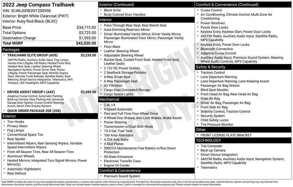 This Jeep Compass is well equipped and includes these key features and benefits, Touchscreen Controls, Backup Camera, Automatic Headlights, Bluetooth Handsfree, AWD / 4x4 / Four Wheel, 10.1" Touchscreen Display, 115V Auxiliary Power Outlet, 2nd Row Heated Seats, 2nd Row USB Type A/C Charge Only, 360 Surround View Camera System, 4G LTE Wi-Fi Hot Spot, Alexa Built-In, Cluster 10.25" TFT Color Display, Connected Travel & Traffic Services, Disassociated Touchscreen Display, Driver Assist Group I, Driver Seat Memory, Foot Activated Open 'N Go Liftgate, For Details, Visit DriveUconnect.com, For More Info, Call 800-643-2112, Global Telematics Box Module (TBM), GPS Navigation, HD Radio, Heated Front Seats, Highway Assist System, Integrated Voice Command w/Bluetooth, Leather Wrapped Steering Wheel, LED Low/Highbeam Projector Headlamps, No Satellite Coverage HI/AK/PR/VI/GU, P&P Park & Unpark Assist System, ParkSense Fr/Rr Park Assist System, Power 8-Way Adjust Front Passenger Seat, Power Adjust 8-Way Driver Seat, Power Liftgate, Premium Leather Trimmed Bucket Seats, Premium LED Fog Lamps, Premium Taillamps, Quick Order Package 2GE, Radio: Uconnect 5 Nav w/10.1" Display, Remote Start System, Reversible Carpet/Vinyl Cargo Mat, SiriusXM Guardian - Included Trial (B), SiriusXM Radio Service, SiriusXM Satellite Radio, SiriusXM w/360L, Traffic Sign Recognition, Trailhawk Elite Group, Universal Garage Door Opener, Vehicle Information Center, Windshield Wiper De-Icer, Wireless Charging Pad. Odometer is 5879 miles below market average! 22/30 City/Highway MPG