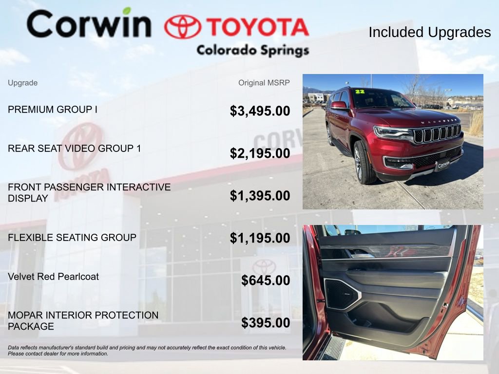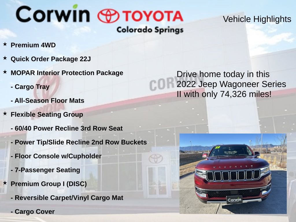 This Jeep Wagoneer is well equipped and includes the following features and benefits, Premium 4WD, 3 Panel Sunroof, 60/40 Power Recline 3rd Row Seat, 7-Passenger Seating, Adjustable Roof Rail Crossbars, All-Season Floor Mats, Amazon Fire TV Built-In, Cargo Cover, Cargo Tray, Flexible Seating Group, Floor Console w/Cupholder, MOPAR Interior Protection Package, Power Tip/Slide Recline 2nd Row Buckets, Premium Group I (DISC), Quick Order Package 22J, Rear Seat Video Group 1, Reversible Carpet/Vinyl Cargo Mat, Seatback Video Screens, Video USB Port.