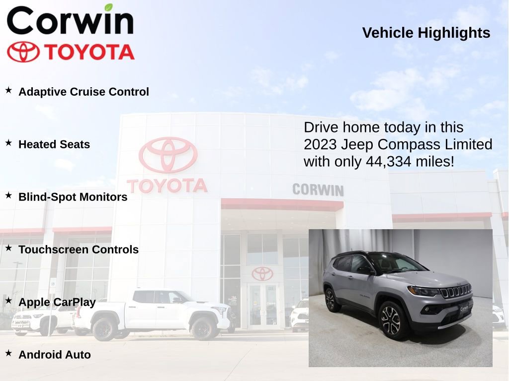 Experience the perfect blend of style, capability, and technology in the 2023 Jeep Compass Limited. Visit our showroom today and let us demonstrate how this exceptional SUV can enhance your driving life.