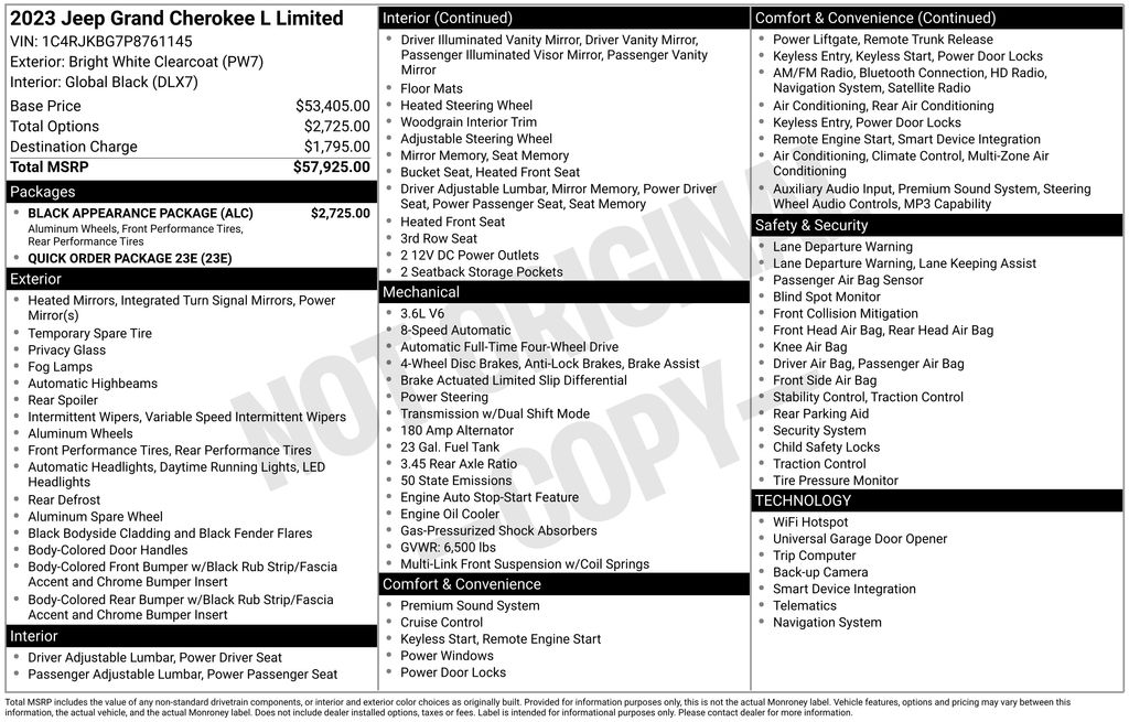 This Jeep Grand Cherokee L is well equipped and includes these key features and benefits, Heated Seats, Navigation System, Touchscreen Controls, Backup Camera, Automatic Headlights, Bluetooth Handsfree, AWD / 4x4 / Four Wheel, 3rd row seats: split-bench, Black Appearance Package, Fully automatic headlights, Gloss Black Exterior Accents, Heated front seats, Molded In Color Black/Gloss Black Roof Rails, Navigation System, ParkView Rear Back-Up Camera, Power Liftgate, Power passenger seat, Power windows, Quick Order Package 23E, Steering wheel mounted audio controls, Wheels: 20" x 8.5" Gloss Black Painted Aluminum.