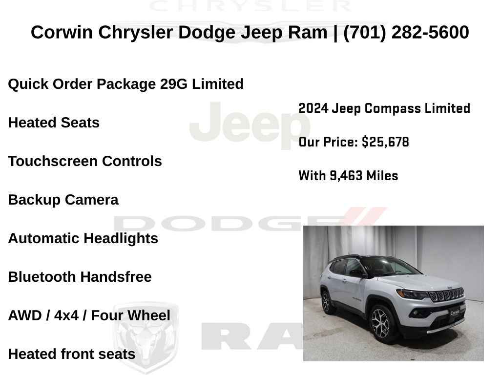 HAPPY HOLIDAYS FROM CORWIN CHRYSLER DODGE JEEP RAM OF FARGO!! WE HAVE STOCKINGS FULL OF SAVINGS ON ALL OF OUR PRE-OWNED VEHICLES AVAILABLE!! WE HAVE ONE OF THE LARGEST SELECTION OF INVENTORIES IN OUR AREA AT ONE SINGLE LOCATION!! Priced below KBB Fair Purchase Price! Silver Zynith Metallic Clearcoat 2024 Jeep Compass Limited FACTORY CERTIFIED 4D Sport Utility 4WD 2.0L I4 DOHC Certified. CARFAX One-Owner.