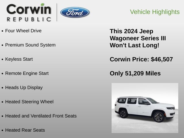 Boasting a host of premium features, the Wagoneer Series III is equipped to elevate your driving experience. Indulge in the comfort of - Four Wheel Drive, Premium Sound System, Keyless Start, Remote Engine Start, Heads Up Display, Heated Steering Wheel, Heated and Ventilated Front Seats, Heated Rear Seats, and Navigation, among other impressive amenities.