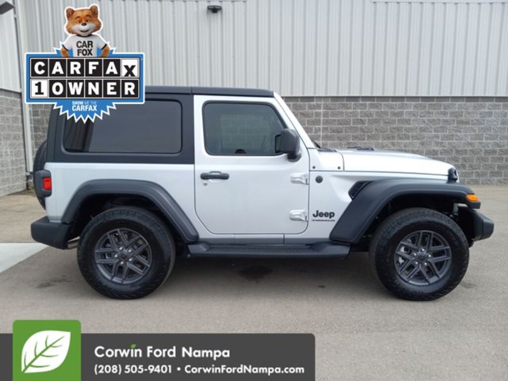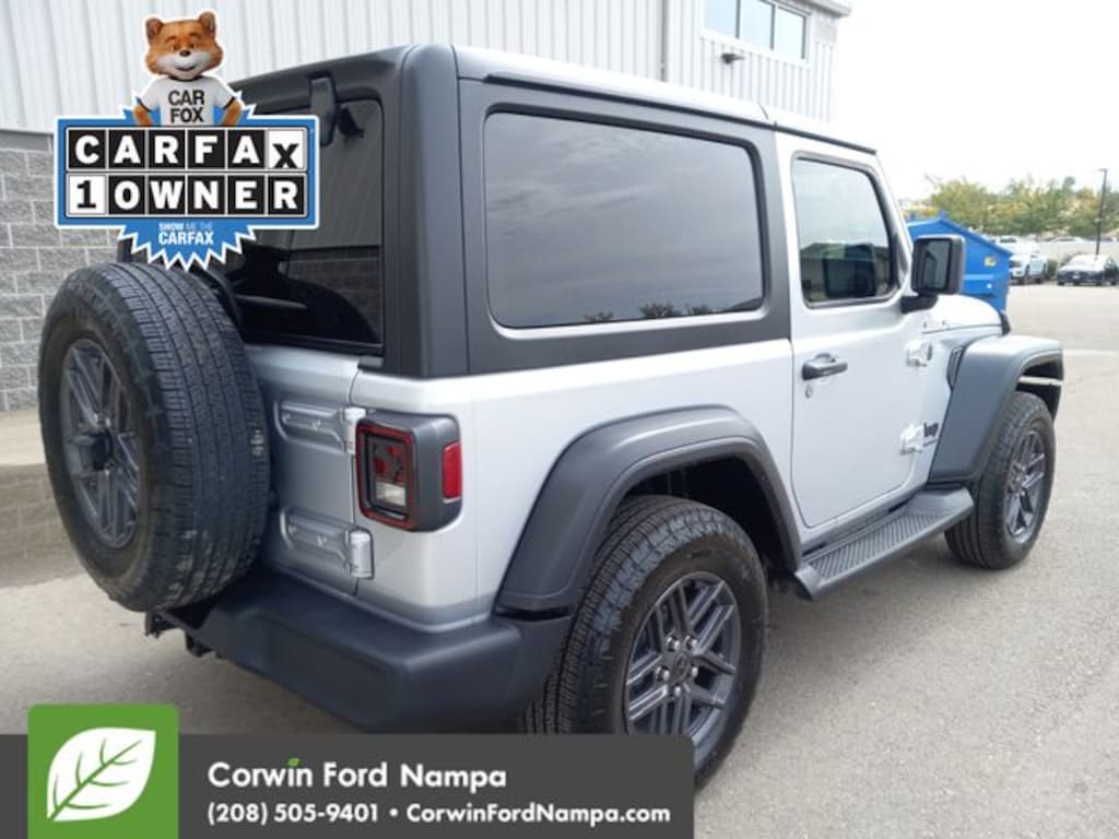 Our Accident Free, One Owner 2024 Jeep Wrangler Sport S 2 Door 4X4 with the Convenience Pack is an authentic adventure machine with an unmistakable Silver Zynith design! Powered by a TurboCharged 2.0 Liter 4 Cylinder providing 270hp matched to an 8 Speed Automatic transmission so you can take on tough trails and win. The robust skid plates and Dana axles also help when you're mastering rugged terrain, and this Four Wheel Drive SUV sees nearly 21mpg on the highway. Our Wrangler is easy to recognize with its fog lamps, a fold-down Gorilla Glass windshield, removable soft top/doors, bold fender flares, alloy wheels, heated power mirrors, and body-color sport bar.