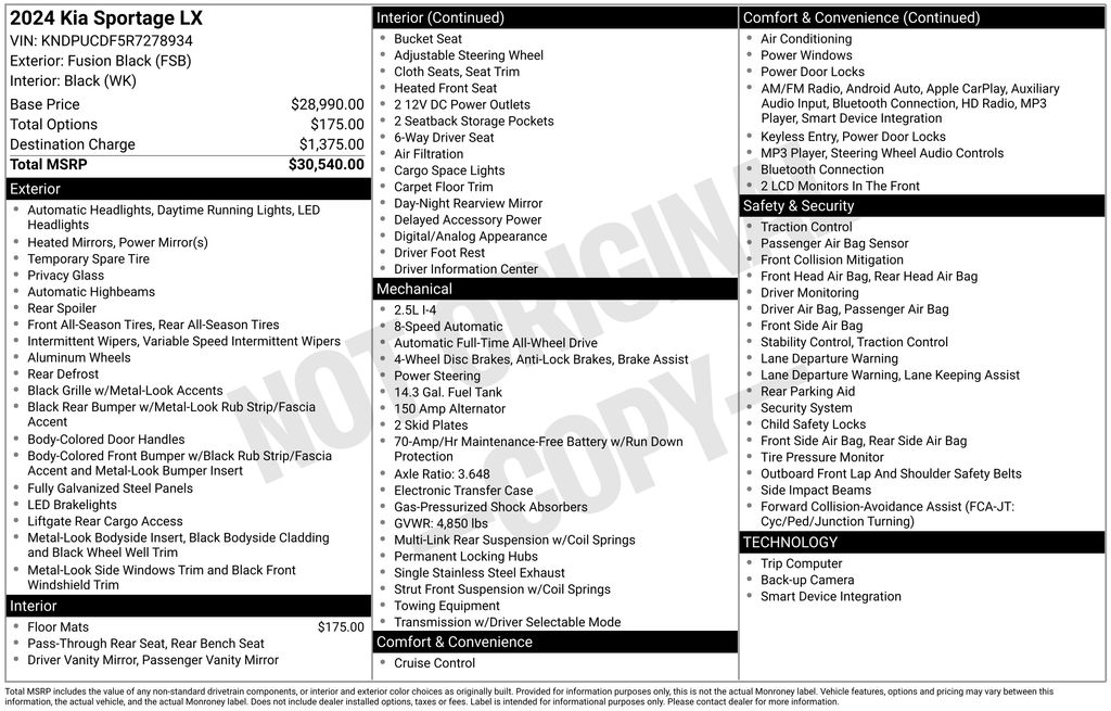 This 2024 Kia Sportage LX is a true standout in its class, offering a winning combination of style, performance, and technology. With a list price of $20,999, this SUV represents an exceptional value that's sure to impress. Don't miss your chance to experience the power and versatility of the Sportage. Visit our showroom today and let us help you find your perfect match.