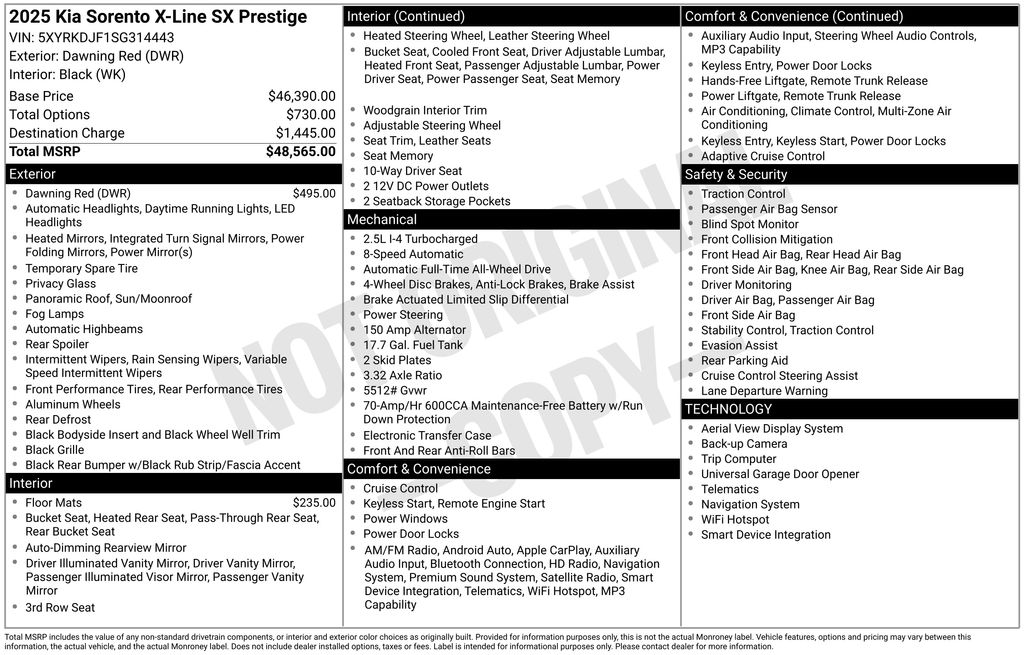Boasting a 2.5L I4 DGI Turbocharged engine, the Sorento X-Line SX Prestige delivers an impressive 281 horsepower, ensuring a thrilling and responsive ride. Paired with an 8-Speed Dual Clutch Transmission and All-Wheel Drive, this SUV provides the perfect balance of power and efficiency, with an EPA-estimated 20 MPG in the city and 27 MPG on the highway.
