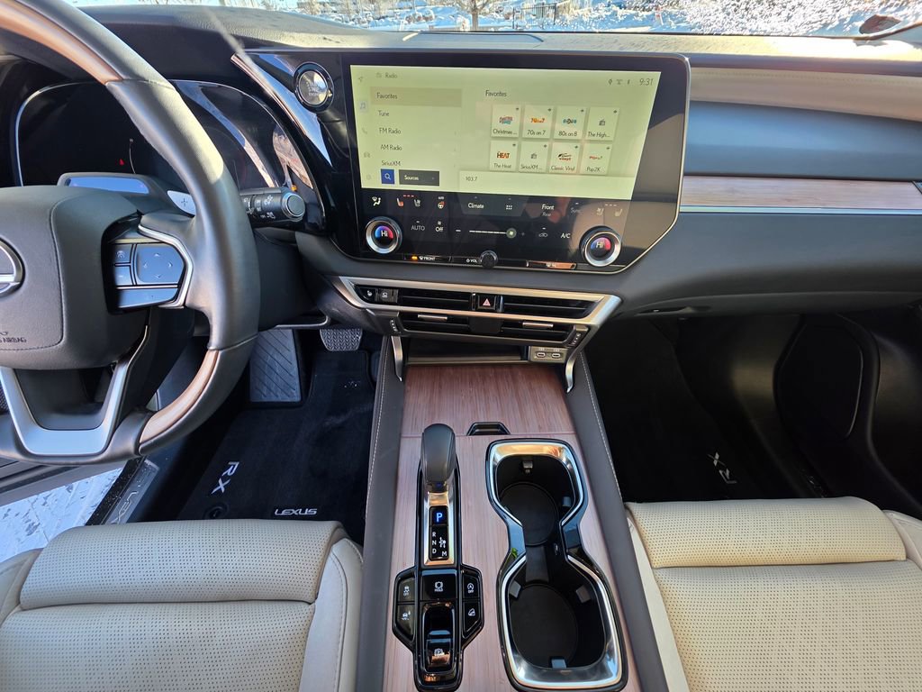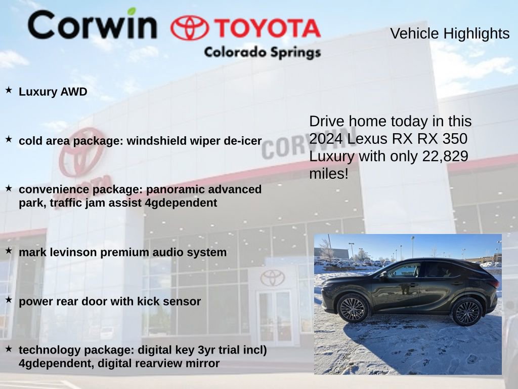 This Lexus RX is well equipped and includes the following features and benefits, Luxury AWD, cold area package: windshield wiper de-icer, convenience package: panoramic advanced park, traffic jam assist 4gdependent, mark levinson premium audio system, power rear door with kick sensor, technology package: digital key 3yr trial incl) 4gdependent, digital rearview mirror, ABS brakes, Active Cruise Control, Alloy wheels, Compass, Electronic Stability Control, Front dual zone A/C, Heated & Ventilated Front Bucket Seats, Heated door mirrors, Heated front seats, Heated rear seats, Illuminated entry, Low tire pressure warning, Power Liftgate, Power moonroof, Remote keyless entry, Traction control. 21/28 City/Highway MPG