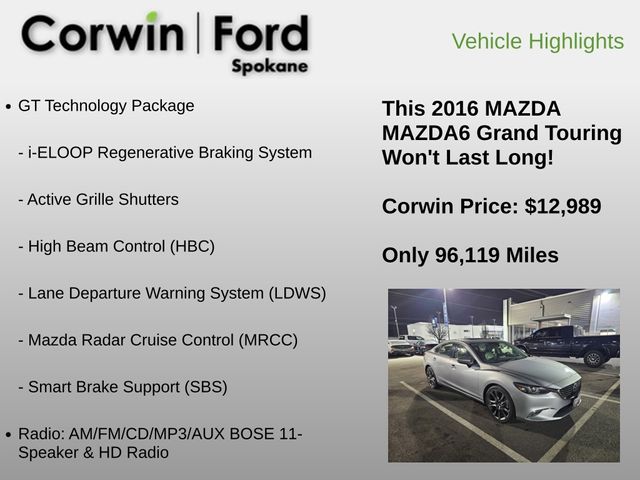 Recent Arrival! Priced below KBB Fair Purchase Price! Turn heads with the bold sophistication of our 2016 Mazda6 Grand Touring Sedan presented in Sonic Silver! Powered by a potent 2.5 Liter 4 Cylinder which generates 184hp while paired with a 6 Speed Automatic transmission with paddle shifters. With this ideal Front Wheel Drive combination, you will love scoring nearly 40mpg on the highway. Wave goodbye to long lines at the pump and hello to your next road adventure in our Mazda6. Check out our Grand Touring's bold front fascia with the signature front bumper and grille!