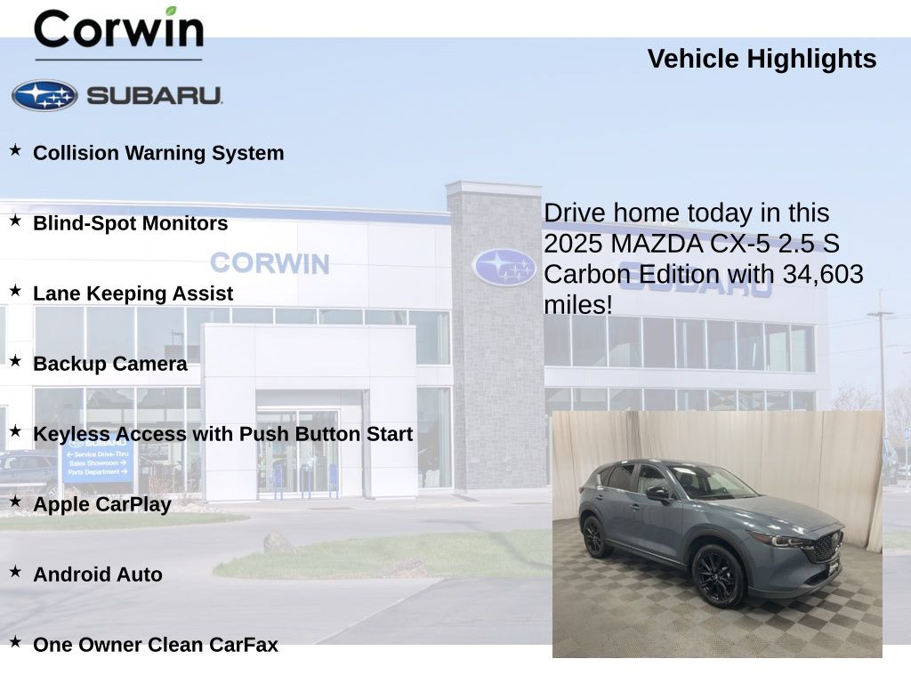 Experience the epitome of modern, sophisticated driving with this exceptional 2025 Mazda CX-5 2.5 S Carbon Edition. This remarkable SUV blends dynamic performance, cutting-edge technology, and refined style, making it the perfect companion for your adventures.